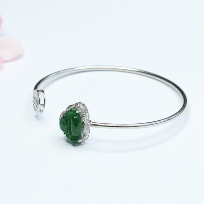 Meticulously handcrafted by our master jewelers, this sacred bangle combines three powerful symbols – luminous jade, joyful Laughing Buddha, and protective sterling silver – into a continuous flow of positive energy. More than jewelry, it’s a wearable affirmation of abundance designed to attract wealth while reminding you to embrace life’s happiness.
