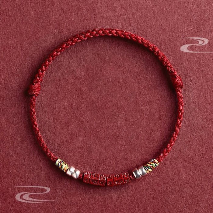 Adorn your wrist with this powerful talisman, combining Tibetan mantra magic with Chinese spiritual traditions. The vibrant red string cradles a 9mm cinnabar bead engraved with sacred syllables, accented by 925 sterling silver spacers—a portable sanctuary for seekers of all ages.