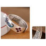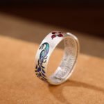 The Buddha Stones 999 Sterling Silver Peacock Auspicious Clouds Engraved Lotus Flower Fortune Ring is a handmade ring made from high-quality 999 sterling silver. The ring features a peacock and lotus symbol, representing self-confidence, wisdom, good fortune, and enlightenment. Sterling silver is believed to have a calming effect and provides protection against evil spirits. The ring has an adjustable inner perimeter of 54-60mm and weighs 5g. It is recommended to store the ring in a dry place to prevent tarnishing.