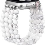 Embrace bohemian elegance with our Boho Chic White Turquoise Apple Watch Band, a stunning fusion of natural stone beauty and contemporary design. This handcrafted band showcases high-quality white turquoise beads interspersed with delicate silver spacer beads, creating a light-catching, textured look that elevates your smartwatch to jewelry status. The matte and polished finishes of the turquoise stones create beautiful visual depth, while the elastic core ensures a comfortable, secure fit for wrists 7-8.5 inches.