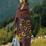 Tibetan Shawl Brown Blue Red Geometric Shapes Pattern Winter Cozy Travel Scarf Wrap