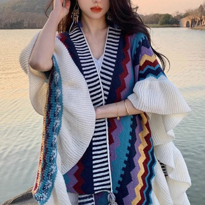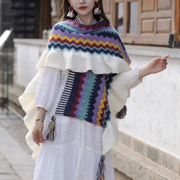 Tibetan Shawl Colorful Striped Wavy Line Tassels Winter Cozy Travel Scarf Wrap
