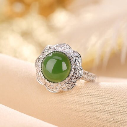 925 Sterling Silver Hetian Cyan Jade Flower Design Luck Adjustable Ring